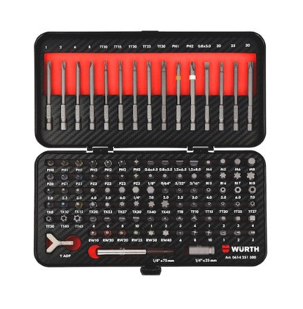 Umfangreiches 1/4 Zoll Bit-Sortiment mit den gängigsten Standard- und Sicherheitsbits in kurzer und langer Ausführung.